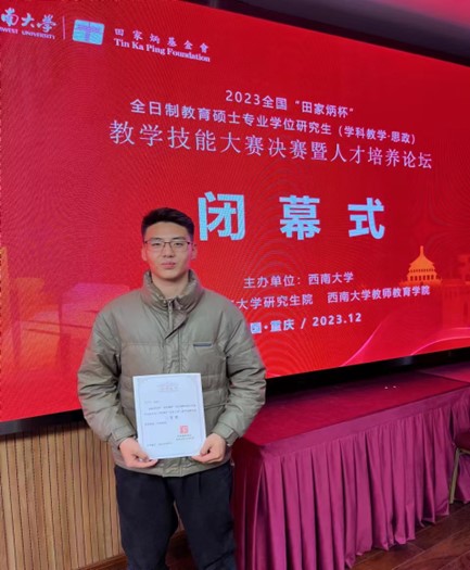 本次大赛共分为校赛、初赛和决赛三个阶段。校内选拔和初赛均采取线上形式进行,包括教学设计、教学视频等内容。经过初赛的激烈竞争,来自全国75所院校的188名选手成功入围决赛。在决赛现场,通过现场抽题、限时备课、授课答辩三个环节的角逐,公司研究生崔子旺同学表现优异,最终荣获大赛二等奖。伟的国际1946bv官网历来高度重视师范生教学技能的培养训练,为做好本次大赛的准备工作,公司专门成立了由研究生教育分管领导、学科教学(思政)专业相关导师教师和辅导员组成的竞赛指导组,全力组织院研究生报名参赛。参赛选手在指导老师的帮助下认真打磨讲课细节,优化教学活动,实现了“教”与“学”,“理论”与“实践”、“过程”与“结果”的高效统一,直至达到良好的效果。
