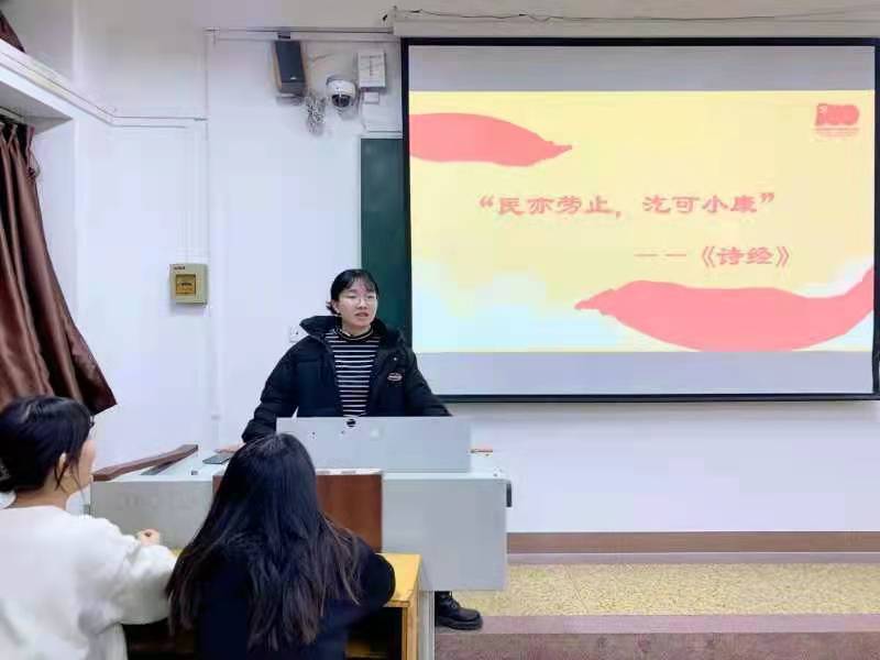 为进一步学习贯彻习近平新时代中国特色社会主义思想和党的十九届六中全会精神,12月9日晚上,伟的国际1946bv官网员工党员宣讲团成员2019级本科生杨耀宇、王丹婷和杨格格在综合楼208教室为2019级2班员工开展宣讲活动。
