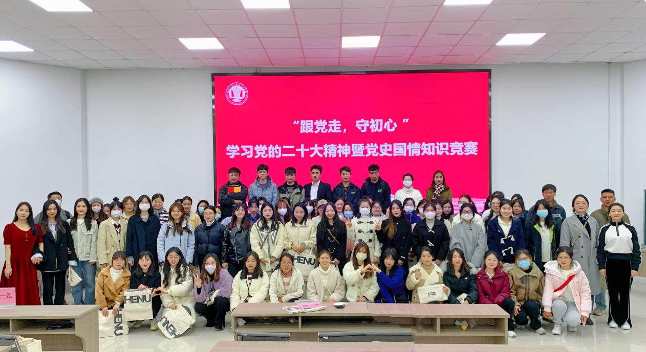 竞赛共分为观看党的二十大报告(节选)、团队车轮战、互动游戏环节、以及抢答赛四个环节。比赛伊始,主持人介绍本次比赛的参赛队伍、评委及比赛规则。比赛现场,选手们进行思维的头脑风暴,充分运用知识认真严谨答题,通过扬帆起航、奋勇争先、谁与争锋三轮的精彩角逐,四组获胜队伍成功晋级决赛。随后,晋级组进入激烈的抢答环节,按照累积分数从高到低决出冠军队。比赛中穿插“你划我猜、听歌识曲”等观众互动环节,现场气氛活跃,观众掌声不断。最后,研学会主席团成员刘青远、万樨烨为获奖队伍颁奖,并合影留念。
