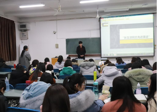 2018级、2017级、2016级团支部分别组织团员观看张玉滚同志先进事迹有关视频,以影像形式生动形象地向团员们展示了张玉滚同志作为一名乡村小学教师,坚守教师岗位17年,无私奉献、默默耕耘,以微薄工资资助三百余名贫困儿童上学的感人事迹。2018级、2017级团支部以PPT讲解的形式对张玉滚同志对党忠诚、吃苦耐劳、爱岗敬业、无私奉献等相关精神进行分析讲解。2016级团支部则组织同学们对张玉滚同志的先进事迹进行讨论,加深团员对此的理解和学习,同学们反响热烈,张贝贝就张玉滚同志的业务能力和奉献精神两个方面的感悟对本次学习发表了自身感言,说到:“通过本次学习,我更加清晰地认识到教师职业的定位和责任,坚定了我身为师范生的责任感和使命感。”