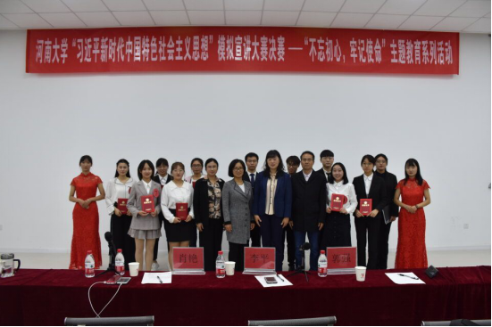 “习近平新时代中国特色社会主义思想”模拟宣讲大赛不仅展现出河大人在思政课上的优秀风采,更增强了新时代思政课的吸引力和感染力,让思政课绽放异彩。据悉,本次活动历经三个月,从初赛环节的宣讲稿评比、复赛环节的宣讲视频评比,再到今天决赛阶段的模拟宣讲风采展示,选手们不断学习、精心准备,为评委和观众带来了一场视听盛宴。经过激烈角逐,产生一等奖2名,二等奖3名,三等奖4名。最后,与会领导为获奖选手颁发荣誉证书并合影留念。