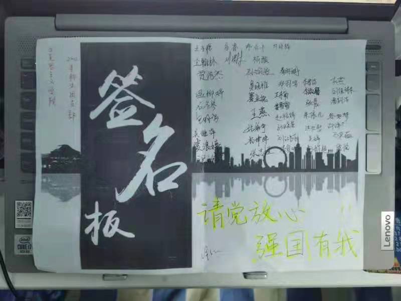 活动伊始,在包羽鸣的带领下,全体团员观看了习近平总书记在庆祝中国共产党成立100周年大会上的讲话视频以及青年代表献词朗诵视频,认真聆听了习近平总书记对青年人的殷切嘱托,共同学习了共青团员和少先队员代表们集体献词原文。支部团学习小组三组组长温柳婷在交流与讨论环节表示,当代青年要胸怀千秋伟业,不负习近平总书记殷切嘱托,一心为团、忠心向党。2020级本科生梁文镯则分享了自己暑期在家乡驻马店做防汛抗疫志愿者的经历,表示这种志愿服务经历让自己更加深刻地认识到了“强国有我”的含义。讨论结束后,支部团员全体起立,庄严宣誓。最后,同学们纷纷在“请党放心,强国有我”的标语纸上签字,并表示将不负时代、努力学习,为祖国建设添砖加瓦,为实现新时代党赋予的历史使命而努力奋斗。