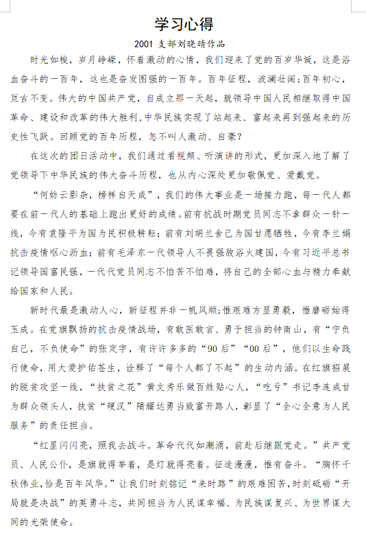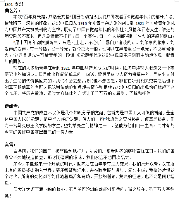 1901本科生团支部将观看庆祝中国共产党成立一百周年的视频与党史知识竞赛结合相,以寝室小组为单位进行答题竞赛,形式新颖,充分调动了青年员工学习党史的兴趣,营造了学习党史的积极氛围,达到了以题促学、以赛促学的效果。活动结束后组织录制视频表达对建党百年的祝福,并通过创作诗歌、撰写心得等形式推动团员们深入了解党的优良传统和作风,鼓励大家做到学史明理、学史增信、学史崇德、学史力行,以昂扬姿态奋力开启全面建设社会主义现代化国家新征程。