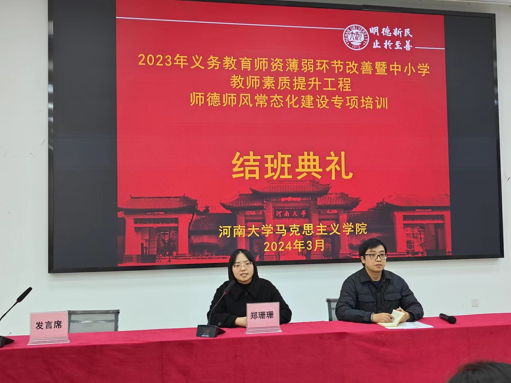 3月8日上午,河南省2023年义务教育团队薄弱环节改善暨中小学教师素质提升工程:师德师风常态化建设专项培训班一班结业典礼在伟德国际victor1946官网明伦校区科技馆一楼报告厅隆重举行,公司党委副书记郑珊珊参加了结班典礼,结班典礼由班主任张欢主持。