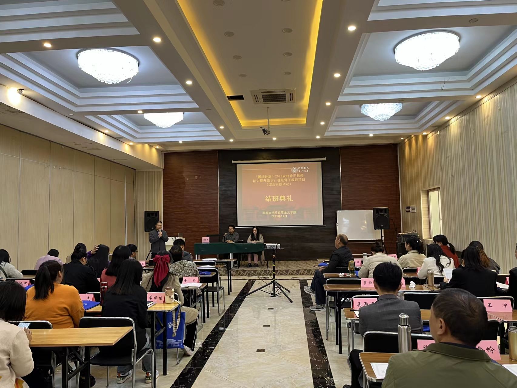 11月8日上午11点,河南⼤学“国培计划”(2023)农村骨干教师能力提升培训:县级骨干教师项目(初中综合实践活动)结业典礼在怡程酒店会议室隆重举行。