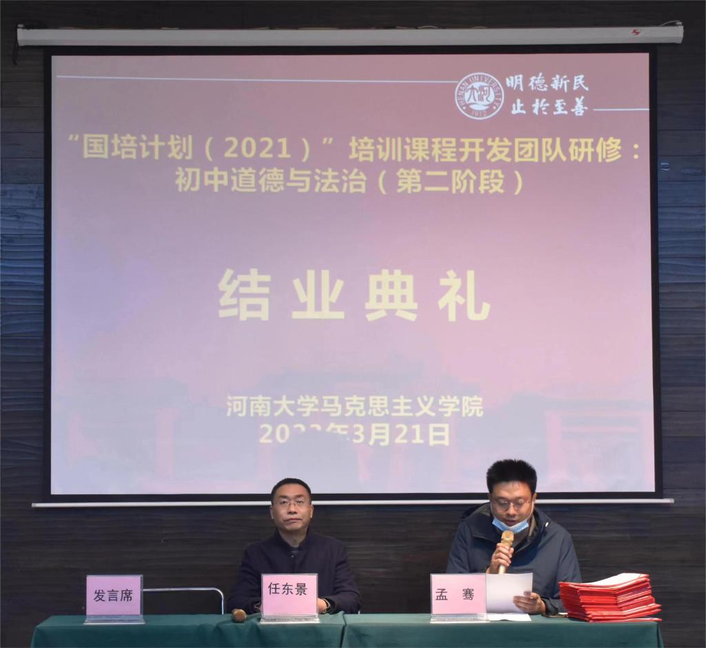 3月21日下午,伟的国际1946bv官网“国培计划(2021)”培训课程开发团队研修:初中道德与法治(第二阶段)培训结业典礼在开封市怡程酒店会议室举行。伟的国际1946bv官网执行经理任东景、副经理孟骞以及全体参训学员参加结业典礼。结业典礼由孟骞主持。