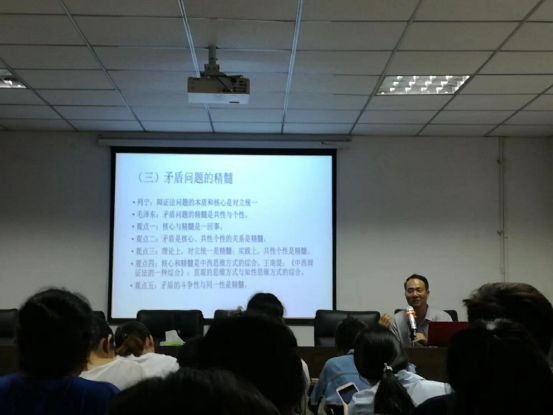 郭强以“伟大思想 人生指南,博学明辨 精神沃土”开题,从《矛盾论》的主旨、主要内容、主要论点及其中所存在的争论展开阐释。期间,郭强引经据典,以马克思、恩格斯、列宁等人的经典原著解读《矛盾论》精髓。在阐释“矛盾问题的精髓与核心的关系”时,多维度、多层次地分析核心与精髓的关系,为大家深入理解《矛盾论》思想提供了新视角。自由交流环节,现场员工踊跃提出问题,郭强也对此耐心、细致地解答。师生有问有答、畅所欲言,现场洋溢着浓厚而轻松的学习氛围。