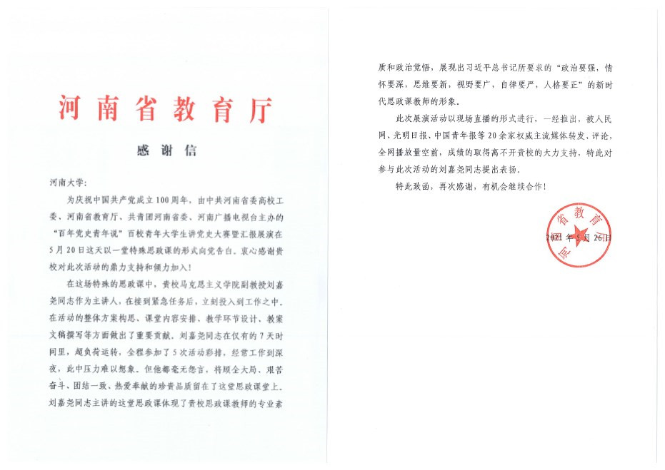 5月26日,河南省教育厅发来感谢信,对公司在由中共河南省委高校工委、河南省教育厅、共青团河南省委、河南广播电视台主办的“百年党史青年说”百校青年老员工讲党史大赛暨汇报展演活动中的鼎力支持和倾力加入表示衷心感谢。