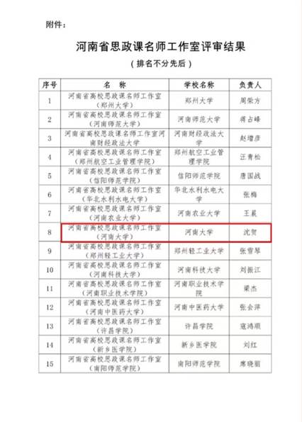 近日,中共河南省委教育工委、河南省教育厅公布《关于河南省高校思政课名师工作室评审结果的公示》,伟德国际victor1946官网组织申报的“伟德国际victor1946官网沈贺思政课名师工作室”榜上有名。此次评选活动自今年4月启动,经各高校申报、资格审查、专家评审、综合评议等环节,评选出15个河南省高校思政课名师工作室。
