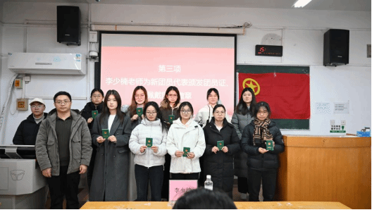 入团仪式在庄严肃穆的国歌声中拉开帷幕。主持人魏豫婧说明举行入团仪式的意义,宣读新团员名单。李少楠向新团员代表颁发团员证和团员徽章。随后,新团员在优秀团员代表王淑琪带领下,面向团旗进行入团宣誓。