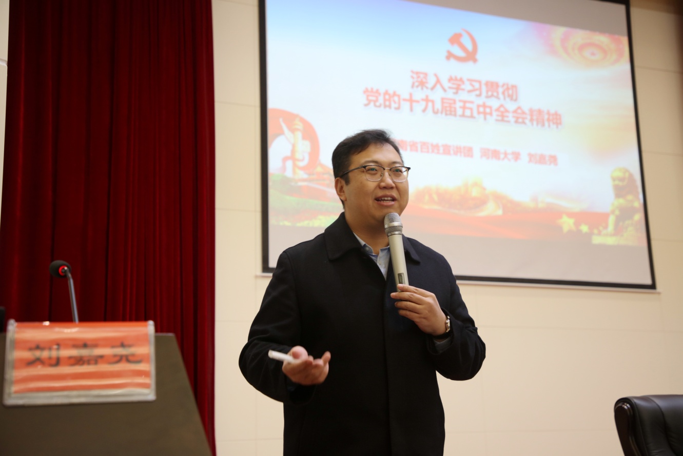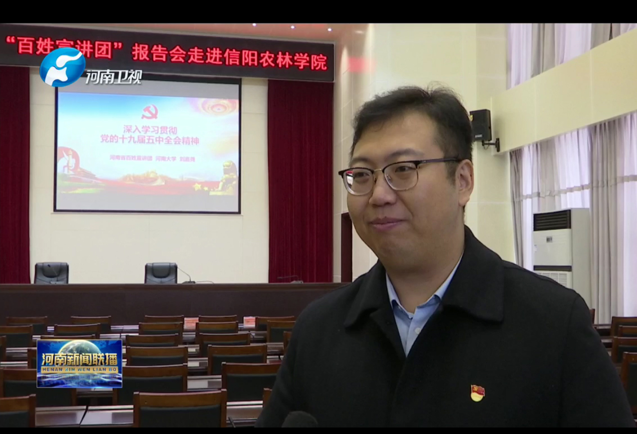 党的十九届五中全会以来,公司伟的国际1946bv官网深入学习贯彻全会精神,开展了形式多样的宣讲活动。公司教师刘嘉尧代表省委百姓宣讲团先后在信阳师范公司、信阳农林公司、伟德国际victor1946官网等高校为青年学子宣讲十九届五中全会精神。河南电视台新闻联播分别于11月30日、12月1日进行了报道。12月7日,中央电视台新闻联播也对宣讲活动进行了播报。