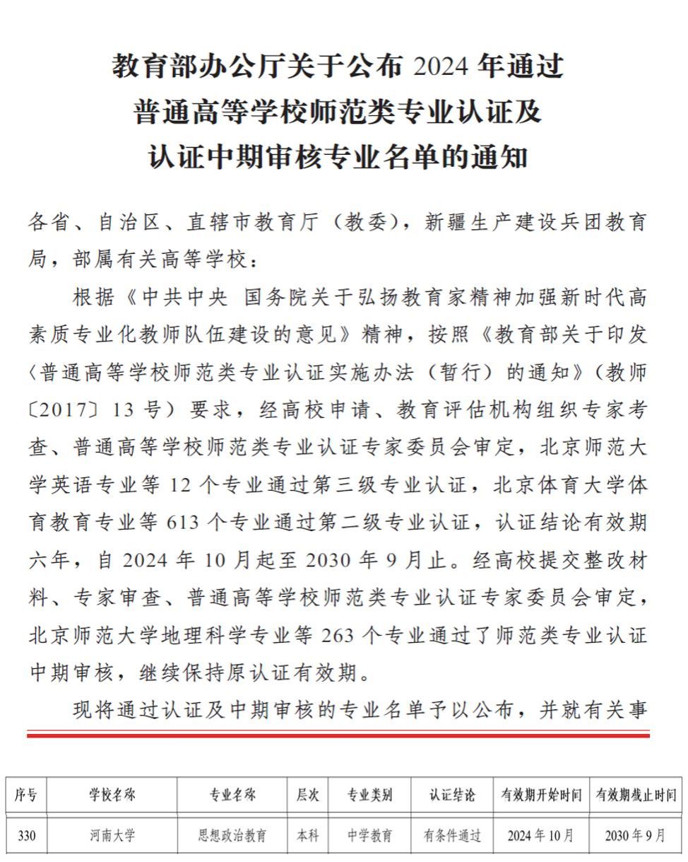 近日,教育部办公厅发布《关于公布2024年通过普通高等公司师范类专业认证及认证中期审核专业名单的通知》,公司思想政治教育本科专业通过2024年普通高等公司师范类第二级认证。