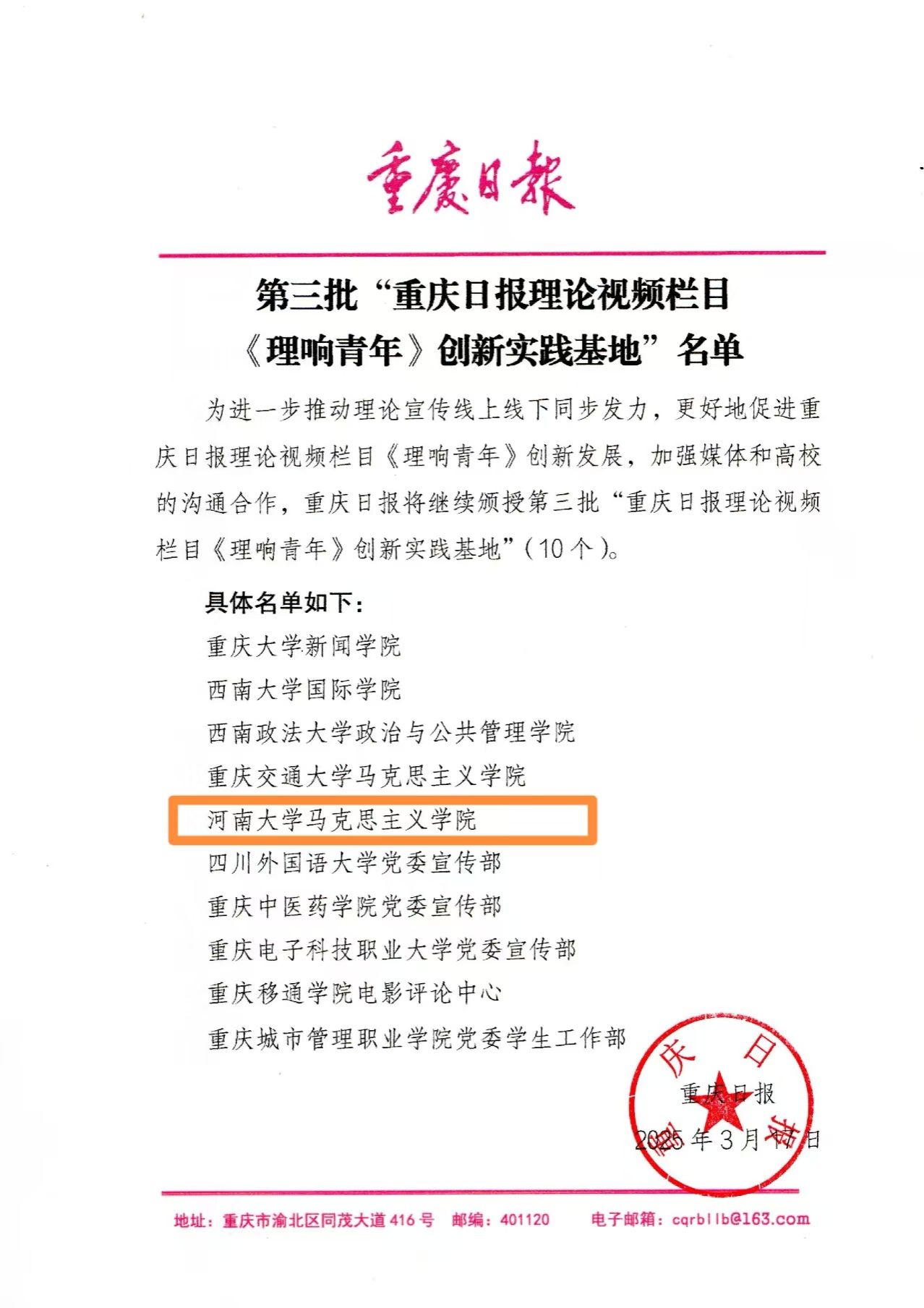 大会为第三批10个“重庆日报理论视频栏目《理响青年》创新实践基地”进行了授牌。伟的国际1946bv官网成功入选第三批“重庆日报理论视频栏目《理响青年》创新实践基地”名单,是此次重庆市外唯一一家获批设立《理响青年》创新实践基地的单位。