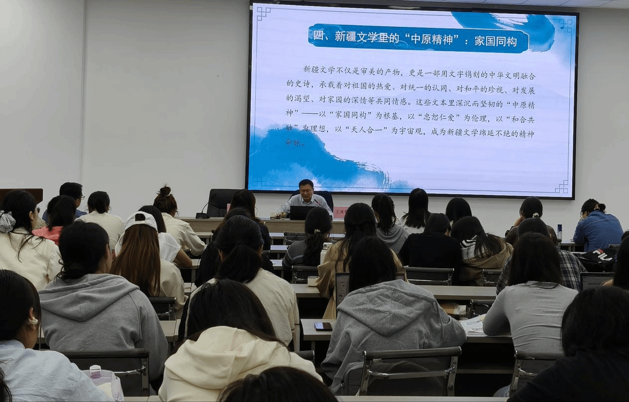 王承哲分别从新疆文学里的“中原故事”“中原符号”“中原表达”“中原精神”四个方面,坚持理论联系实际深入分析新疆文学与中原文化的交流与融合、碰撞与发展。在谈到“中原故事”时,他以丝路传说和丝路开拓为重点,详细叙述了中原文化与西域的早期交流。紧接着他提到现今的新疆文学中有诸多“中原符号”,他以新疆文学作品《散失的母亲》《我的阿勒泰》与《大地上的云朵》为例一一讲述,强调新疆文学中的“中原符号”并不是简单的文化移植,而是漫长的本土化、民族化与时代化的过程。然后,他表示新疆文学中不仅有“中原符号”,而且还存在深层次的“中原表达”与“中原精神”,新疆文学中自然流淌着中原文化的血脉,其用文字生动展现着中华文明的融合进程。讲座最后,王承哲指出,我们要坚定文化自信,自信方能自强;要秉持开放包容,各美其美,才能美美与共;要强化身份认同,构建中华民族共有精神家园;要坚持守正创新,铸牢中华民族共同体意识。